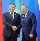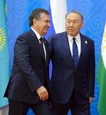 Президент Казахстана Нурсултан Назарбаев (справа) и президент Узбекистана Шавкат Мирзиеев (слева) перед заседанием совета глав государств - членов Шанхайской организации сотрудничества (ШОС).