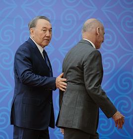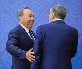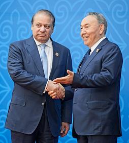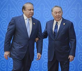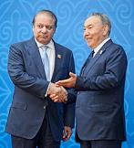 Премьер-министр Пакистана Наваз Шариф (слева) и президент Казахстана Нурсултан Назарбаев (справа) перед заседанием совета глав государств - членов Шанхайской организации сотрудничества (ШОС).