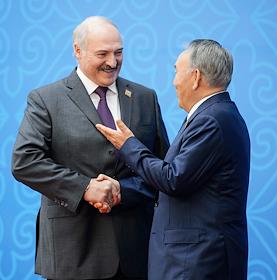 Президент Белоруссии Александр Лукашенко (справа) и президент Казахстана Нурсултан Назарбаев (слева) перед заседанием совета глав государств - членов Шанхайской организации сотрудничества (ШОС).