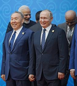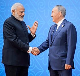 Премьер-министр Индии Нарендра Моди (слева) и президент Казахстана Нурсултан Назарбаев (справа) перед заседанием совета глав государств - членов Шанхайской организации сотрудничества (ШОС).