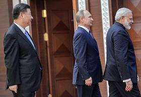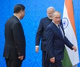 Слева направо: председатель КНР Си Цзиньпин, президент России Владимир Путин и премьер-министр Индии Нарендра Моди и перед заседанием совета глав государств - членов Шанхайской организации сотрудничества (ШОС).
