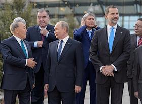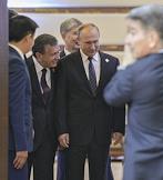Слева направо: президент Узбекистана Шавкат Мирзиеев, президент России Владимир Путин, президент Киргизии Алмазбек Атамбаев и президент Казахстана Нурсултан Назарбаев перед заседанием совета глав государств - членов Шанхайской организации сотрудничества (ШОС).