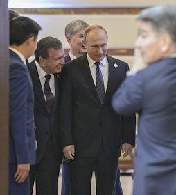 Президент России Владимир Путин (справа) и президент Узбекистана Шавкат Мирзиеев (слева) перед заседанием совета глав государств - членов Шанхайской организации сотрудничества (ШОС).