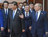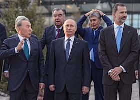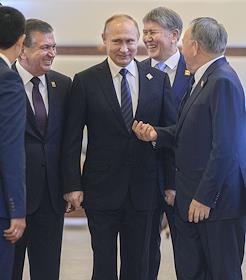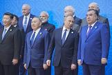 Слева направо: председатель КНР Си Цзиньпин, президент Узбекистана Шавкат Мирзиеев, президент Киргизии Алмазбек Атамбаев, президент России Владимир Путин и президент Казахстана Нурсултан Назарбаев перед заседанием совета глав государств - членов Шанхайской организации сотрудничества (ШОС).