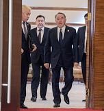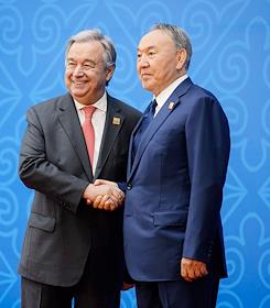 Генеральный секретарь ООН Антониу Гутерриш (слева) президент Казахстана Нурсултан Назарбаев (справа) перед заседанием совета глав государств - членов Шанхайской организации сотрудничества (ШОС).