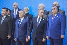 Слева направо: президент Узбекистана Шавкат Мирзиеев, председатель КНР Си Цзиньпин, президент Казахстана Нурсултан Назарбаев, премьер-министр Индии Нарендра Моди и президент России Владимир Путин перед заседанием совета глав государств - членов Шанхайской организации сотрудничества (ШОС).