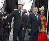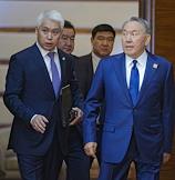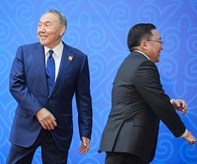 Президент Казахстана Нурсултан Назарбаев (слева) и президент Монголии Цахиагийн Элбэгдорж (справа) перед заседанием совета глав государств - членов Шанхайской организации сотрудничества (ШОС).
