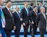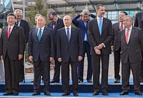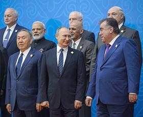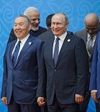 Слева направо: министр иностранных дел Ирана Джавад Зариф, председатель КНР Си Цзиньпин, президент Казахстана Нурсултан Назарбаев, премьер-министр Индии Нарендра Моди и президент России Владимир Путин перед заседанием совета глав государств - членов Шанхайской организации сотрудничества (ШОС).