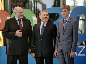 Рабочая поездка президента Росси Владимира Путина в Астану. Церемония открытия международной специализированной выставки "Астана ЭКСПО 2017". Президент Казахстана Нурсултан Назарбаев (в центре) и президент Белоруссии Александр Лукашенко (слева) с сыном Николаем (справа) перед началом церемонии.