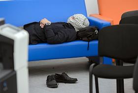 Церемония открытия международной специализированной выставки "Астана ЭКСПО 2017". Жанровая фотография. Мужчина в арабком платке спит без туфель на диване перед началом церемонии.