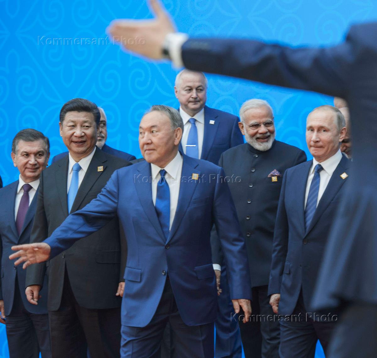 Слева направо: президент Узбекистана Шавкат Мирзиеев, председатель КНР Си Цзиньпин, президент Казахстана Нурсултан Назарбаев, премьер-министр Индии Нарендра Моди и президент России Владимир Путин перед заседанием совета глав государств - членов Шанхайской организации сотрудничества (ШОС).