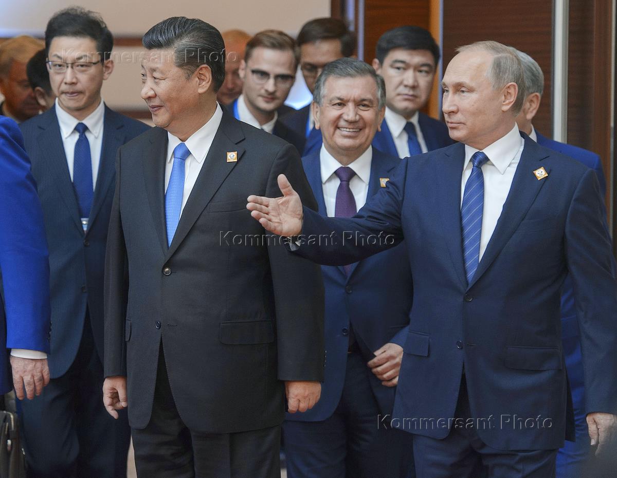 Председатель КНР Си Цзиньпин (второй слева), президент Узбекистана Шавкат Мирзиеев (в центре) и президент России Владимир Путин (справа) перед заседанием совета глав государств - членов Шанхайской организации сотрудничества (ШОС).