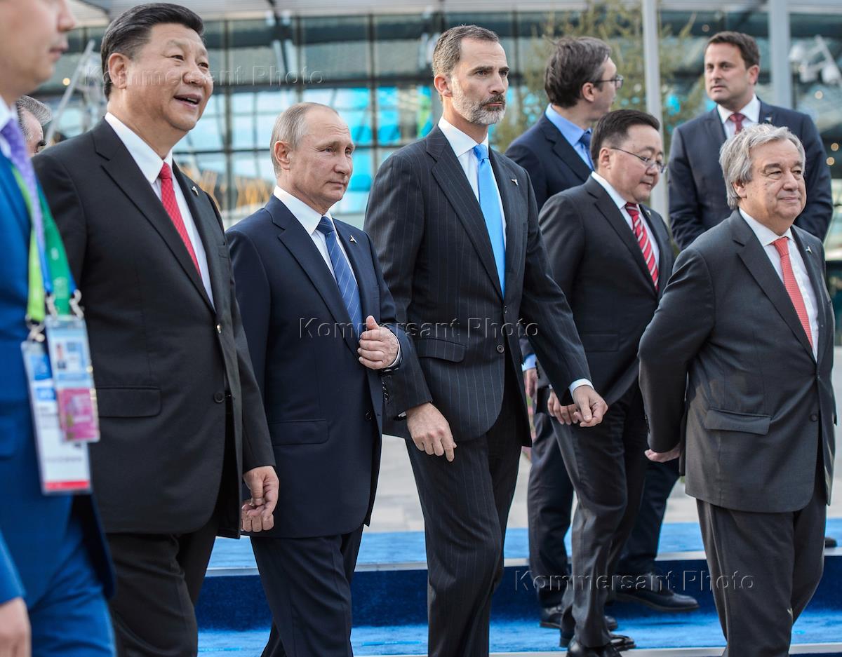 Рабочая поездка президента Росси Владимира Путина в Астану. Церемония открытия международной специализированной выставки "Астана ЭКСПО 2017". Слева направо: председатель КНР Си Цзиньпин, президент Казахстана Нурсултан Назарбаев, президент России Владимир Путин во время совместного фотографирования глав делегаций государств-участников международной специализированной выставки "Астана ЭКСПО-2017".