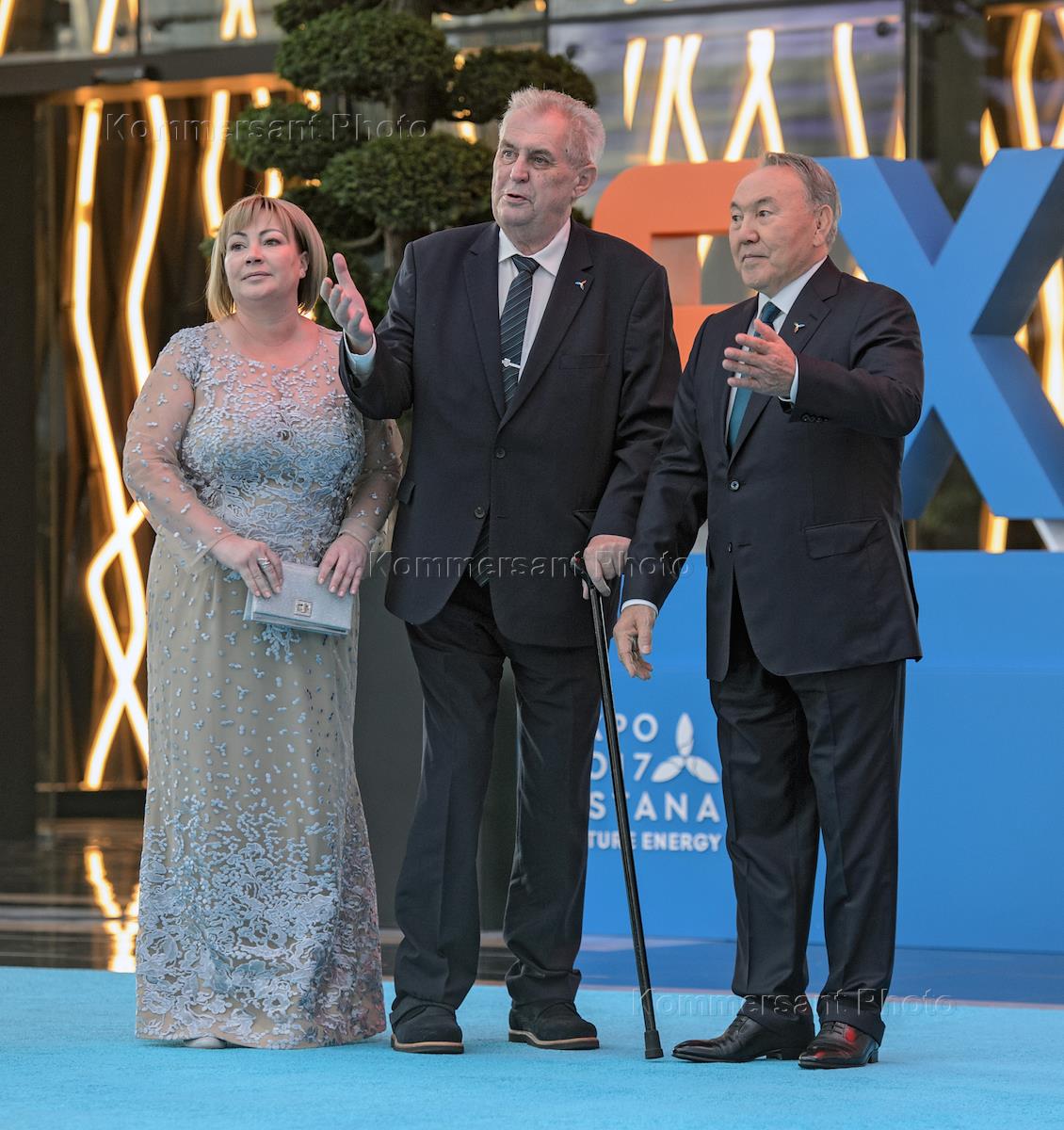Церемония открытия международной специализированной выставки "Астана ЭКСПО 2017". Президент Чехии Милош Земан (в центре), его супруга Ивана (слева) и президент Казахстана Нурсултан Назарбаев (справа) перед началом церемонии.