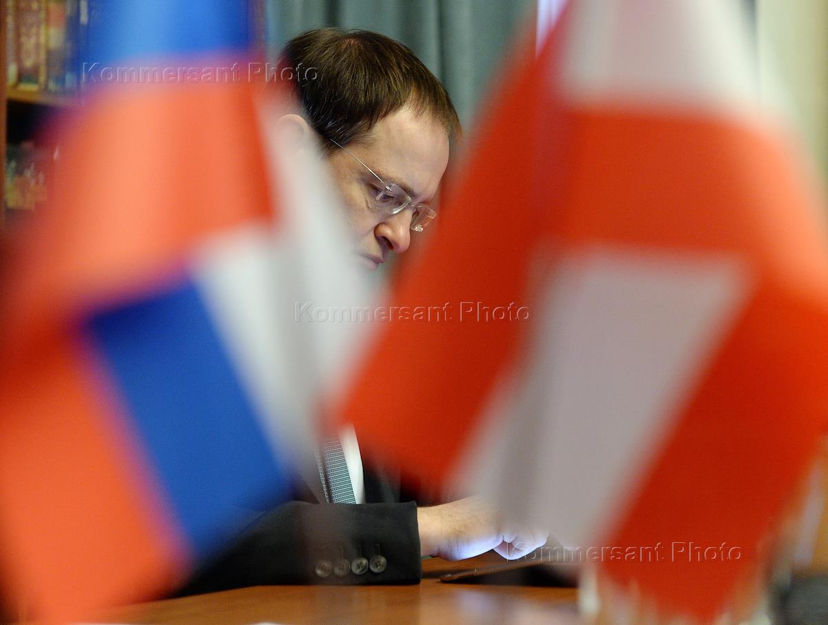 Российско-австрийский симпозиум "Сигизмунд Герберштейн: дипломат, писатель, путешественник" прошел в Всероссийской государственной библиотеке иностранной литературы имени М.И.Рудомино. Министр культуры России Владимир Мединский (справа) и посол Австрии в России Эмиль Брикс (слева) во время симпозиума.