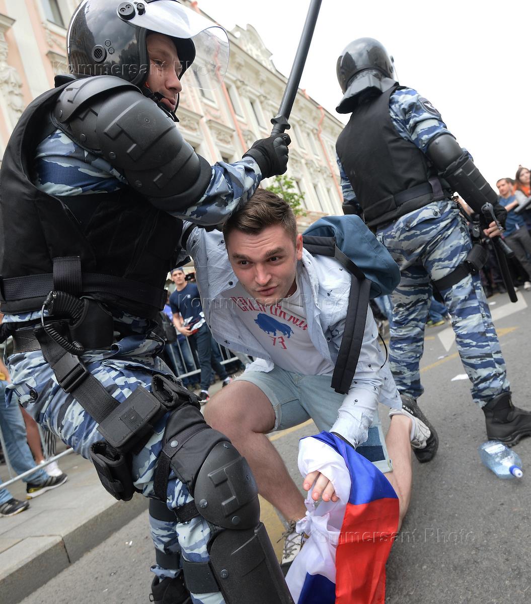 A demonstrator is detained by riot police during an anti-corruption protest organised by opposition leader Alexei Navalny, on Tverskaya Street in central Moscow.