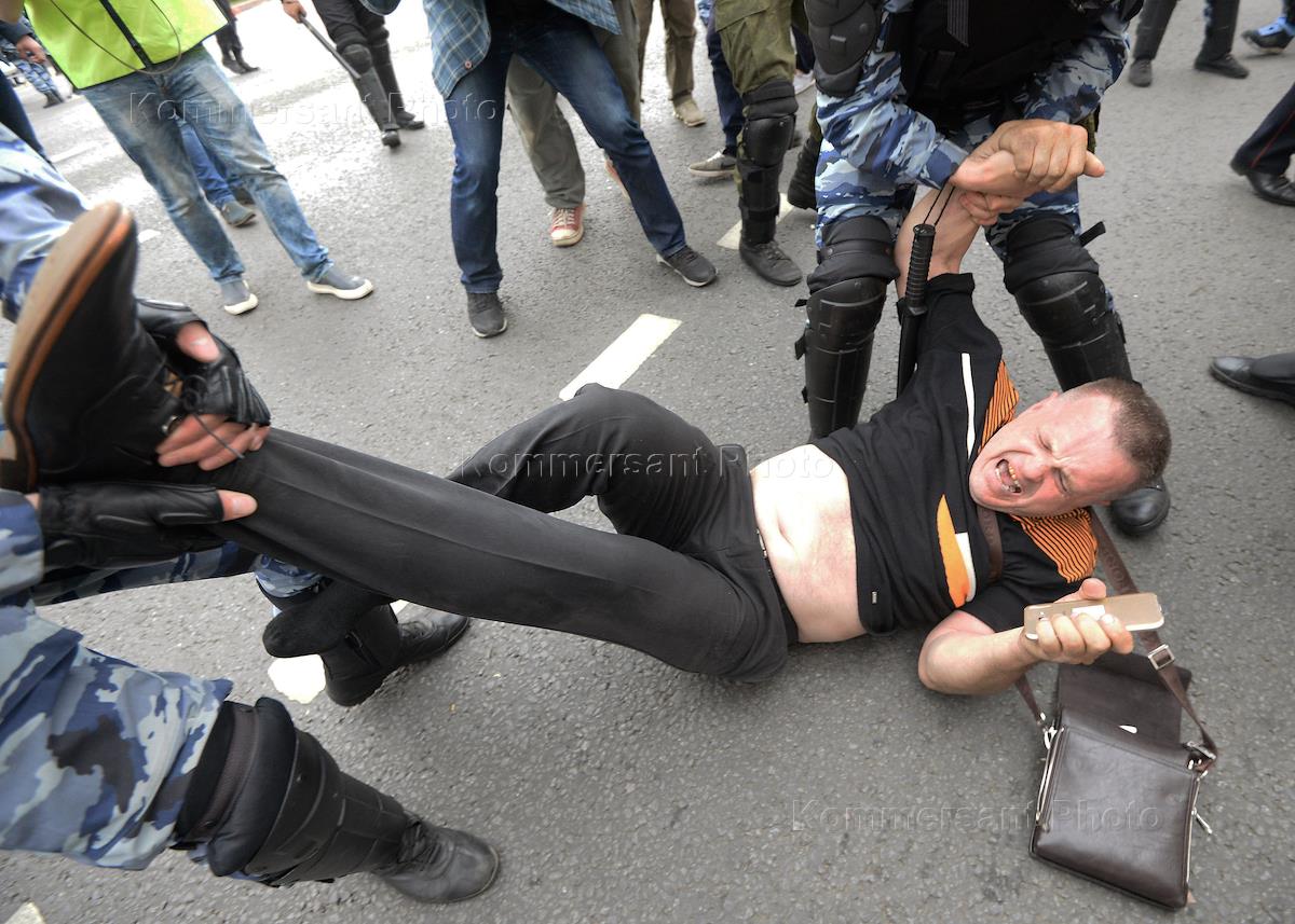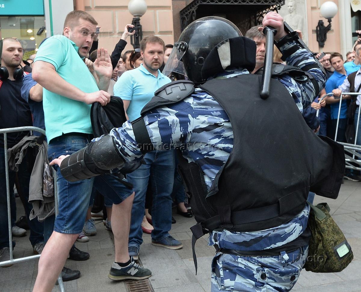 Митинг против коррупции по заявке директора организации "Фонд борьбы с коррупцией" Романа Рубанова на Тверской улице. Сотрудники полиции во время задержания участника митинга.