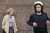 Антикоррупционный митинг прошел на Марсовом поле. Пожилая женщина у гранитной стены и сотрудник правоохранительных органов перед началом митинга.