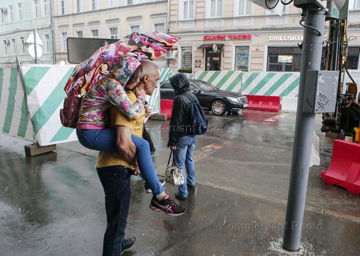 Непогода в Москве. Последствия ливневых дождей. Мужчина несет на плечах ребенка под дождем.