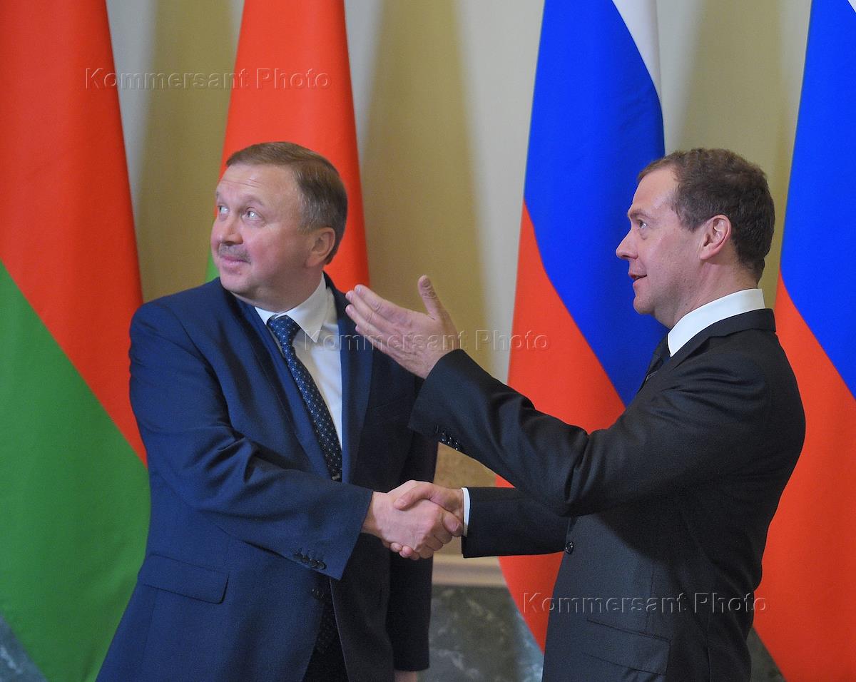 Председатель правительства России Дмитрий Медведев (справа) и премьер-министр Белоруссии Андрей Кобяков (слева) во время встречи перед началом заседания Совета министров Союзного государства России и Белоруссии. Заседания прошло в Константиновском дворце.