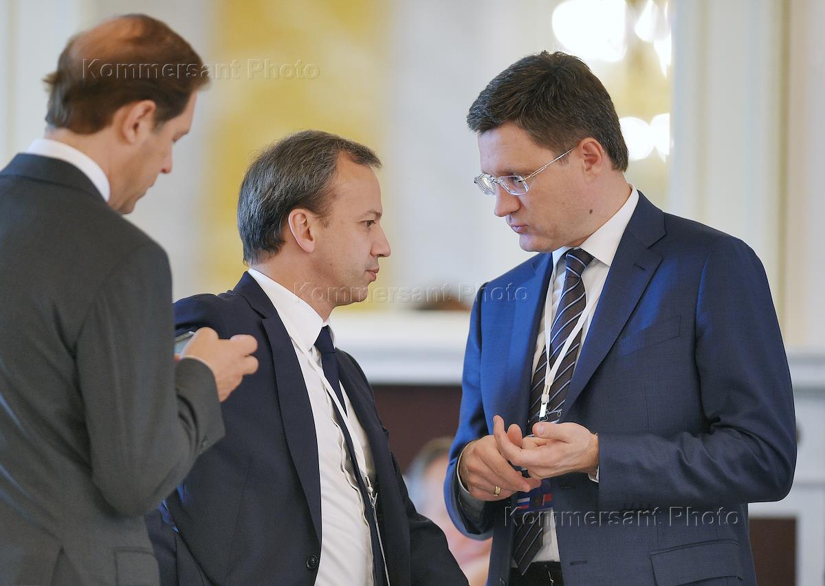 Заседание Совета министров Союзного государства России и Белоруссии в Константиновском дворце. Слева направо: министр промышленности и торговли России Денис Мантуров, заместитель председателя правительства России Аркадий Дворкович и министр энергетики России Александр Новак во время заседания.