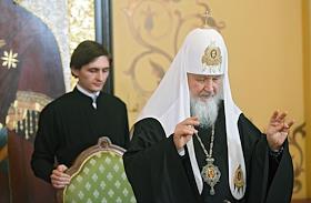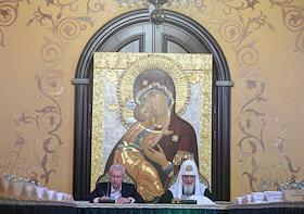 VII заседание попечительского совета Фонда "Поддержки строительства храмов г. Москвы" прошло в Храме Христа Спасителя. Патриар Московский и Всея Руси Кирилл (справа) во время заседания.