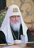 VII заседание попечительского совета Фонда "Поддержки строительства храмов г. Москвы" прошло в Храме Христа Спасителя. Патриарх Московский и Всея Руси Кирилл во время заседания.
