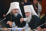 VII заседание попечительского совета Фонда "Поддержки строительства храмов г. Москвы" прошло в Храме Христа Спасителя. Митрополит Рязанский и Михайловский Марк (слева) и митрополит Истринский Арсений (справа) во время заседания.