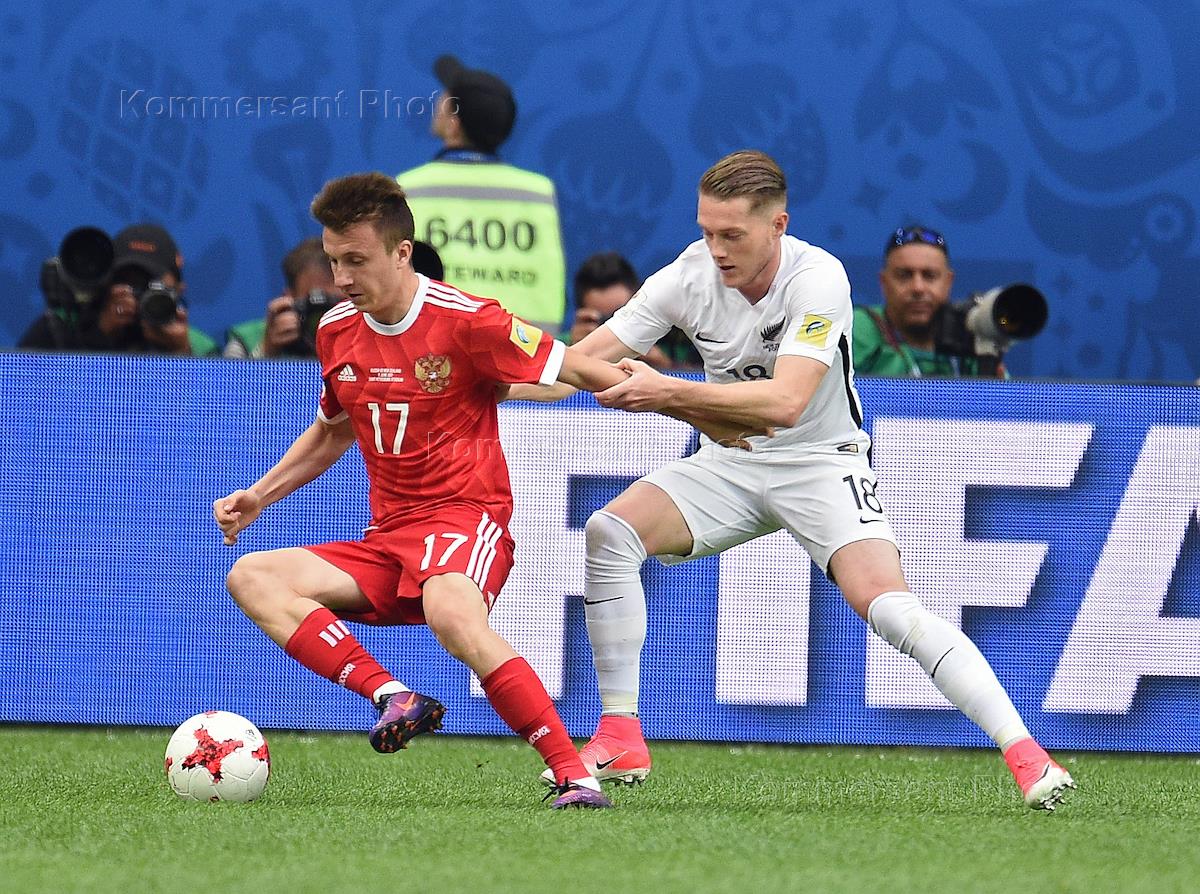Кубок конфедераций FIFA 2017. Матч между сборными России и Новой Зеландии прошел на стадионе "Санкт-Петербург". Игрок сборной России Денис Глушаков (слева) во время матча.