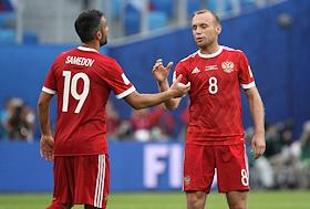 Кубок конфедераций FIFA 2017. Матч между сборными России и Новой Зеландии прошел на стадионе "Санкт-Петербург". Игроки сборной России Александ Самедов (слева) и Денис Глушаков (справа) во время матча.