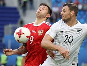 Кубок конфедераций FIFA 2017. Матч между сборными России и Новой Зеландии прошел на стадионе "Санкт-Петербург". Игрок сборной России Федор Смолов (слева) и игрок сборной Новой Зеландии Кип Колви (справа) во время матча.