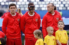 Кубок конфедераций FIFA 2017. Матч между сборными России и Новой Зеландии прошел на стадионе "Санкт-Петербург". Игроки сборной России Виктор Васин (слева) и Денис Глушаков (справа) во время матча.
