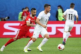 Кубок конфедераций FIFA 2017. Матч между сборными России и Новой Зеландии прошел на стадионе "Санкт-Петербург". Игрок сборной Новой Зеландии Михаэл Боксолл (справа) и игрок сборной России Дмитрий Полоз (слева) во время матча.