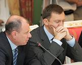 Председатель Правительства России Михаил Фрадков (слева) и председатель совета директоров "Ренова" Виктор Вексельберг (справа) перед началом встречи Президента России с представителями бизнеса России. Встреча прошла в Кремле.