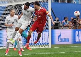 Кубок конфедераций FIFA 2017. Матч между сборными России и Новой Зеландии прошел на стадионе "Санкт-Петербург". Игрок сборной России Георгий Джикия (слева) и игрок сборной Новой Зеландии Вуд Крис (справа) во время матча.