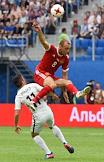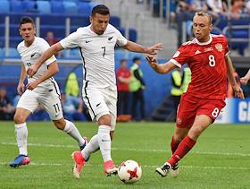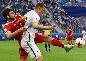 Кубок конфедераций FIFA 2017. Матч между сборными России и Новой Зеландии прошел на стадионе "Санкт-Петербург". Игрок сборной Новой Зеландии Рохас Марко (слева) и игрок сборной России Дмитрий Тарасов (справа) во время матча.