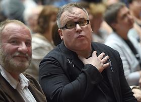 Церемония открытия выставки Recycle Group. Homo virtualis в Государственном музее изобразительных искусств (ГМИИ) имени А.С. Пушкина. Писатель Александр Шаталов (слева) во время церемонии.