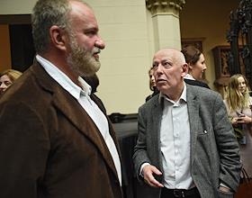 Церемония открытия выставки Recycle Group. Homo virtualis в Государственном музее изобразительных искусств (ГМИИ) имени А.С. Пушкина. Cовладелец галерее "Триумф" Емельян Захаров (слева) и директор Института проблем современного искусства Иосиф Бакштейн (справа) во время церемонии.
