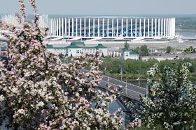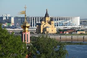 Виды Нижнего Новгорода. Стадион "Нижний Новгород", Новоярмарочный храм в честь Александра Невского (в центре) и Рождественская церковь (слева).