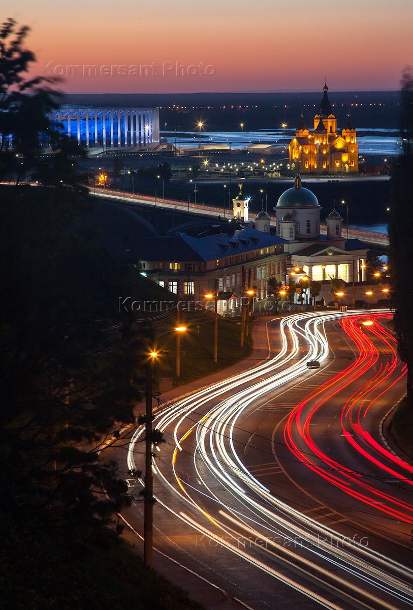 Виды Нижнего Новгорода. Похвалинский съезд и храм Митрополита Алексия. Новоярмарочный храм Александра Невского и стадион "Нижний Новгород".