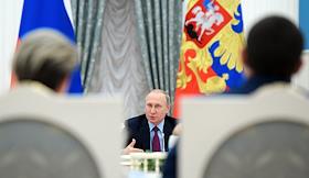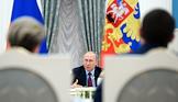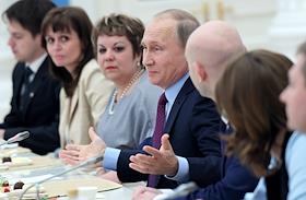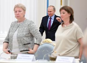 Президент России Владимир Путин (в центре) во время встречи с учителями – наставниками выпускных классов в Кремле.
