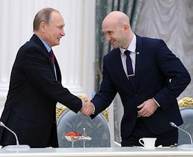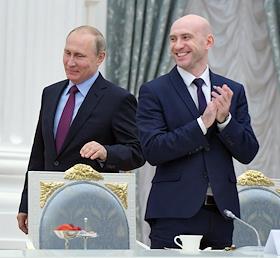 Встреча президента России Владимира Путина с учителями – наставниками выпускных классов в Кремле. Президент России Владимир Путин (слева) и учитель истории, классный руководитель ГБОУ "Лицей №1367" Герман Хаткевич (справа) во время встречи.