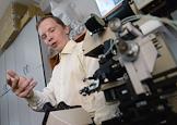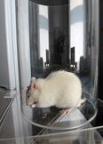 Жанровая фотография. Белая лабораторная крыса в стеклянной колбе в лаборатории структуры и функции митохондрий НИИ физико-химической биологии имени А.Н.Белозерского.