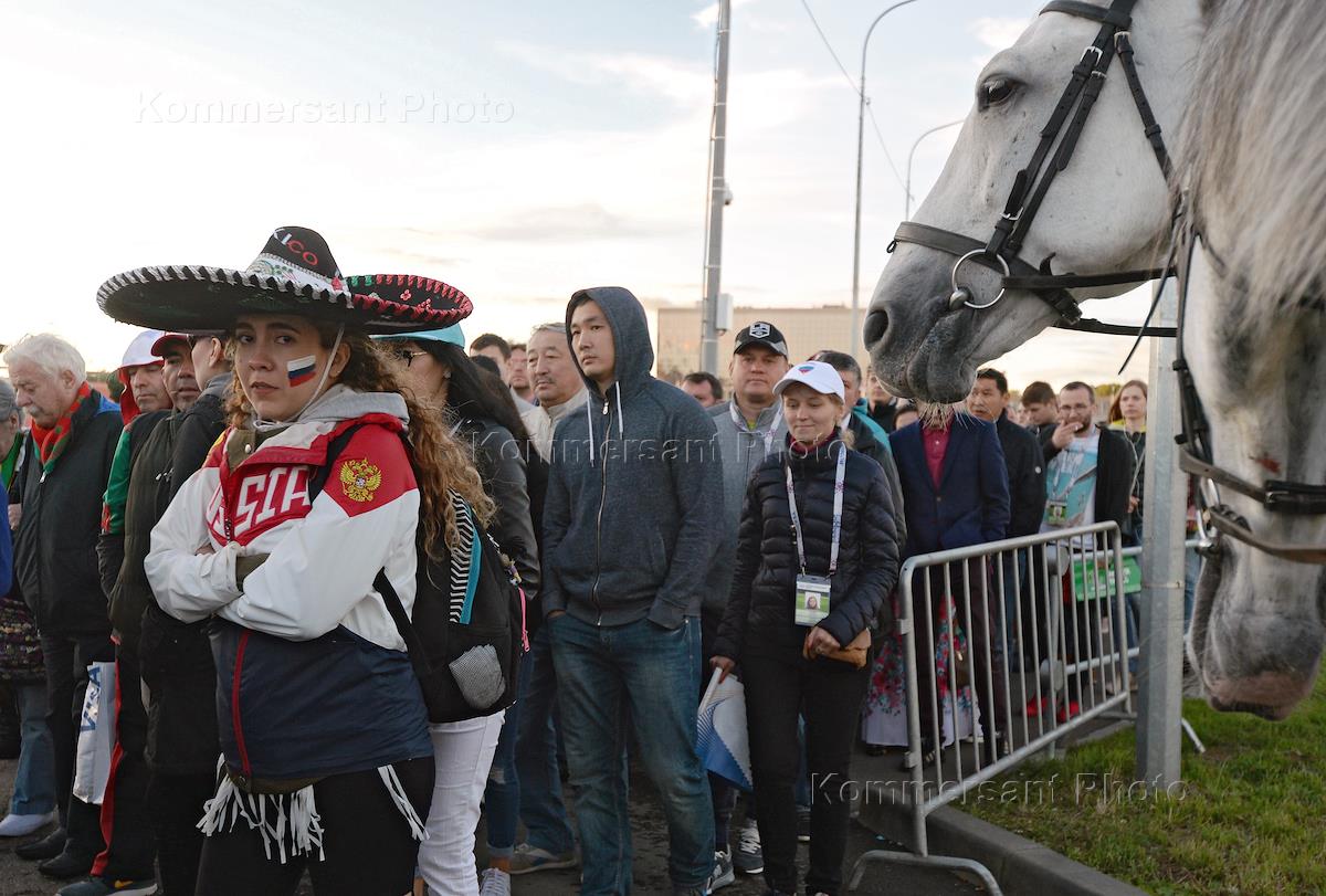 Жанровая фотография. Кубок конфедераций FIFA 2017. Болельщики и сотрудники конной полиции перед началом матча.