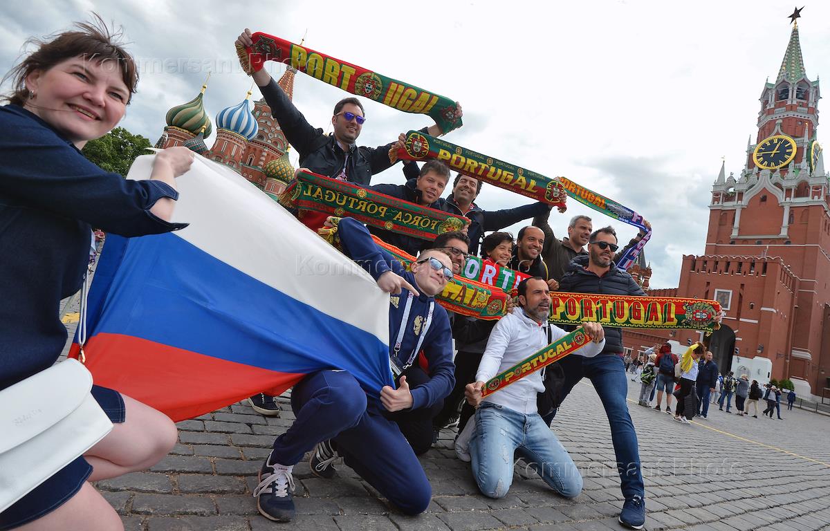 Кубок конфедераций FIFA 2017. Болельщики сборной России (слева) и сборной Португалии (справа) на Красной площади.