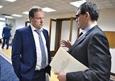 Председатель Комиссии по обшественному контролю и взаимодействию с общественными организациями Общественной палаты России Владимслав Гриб (слева) и сопредседатель Общероссийской общественной огранизации "Деловая Россия", председатель совета директоров Группы "КАСКОЛ" Сергей Недорослев (справа) перед началом заседания правительственной комиссии по координации деятельности Открытого правительства. Заседание прошло в Доме правительства России.