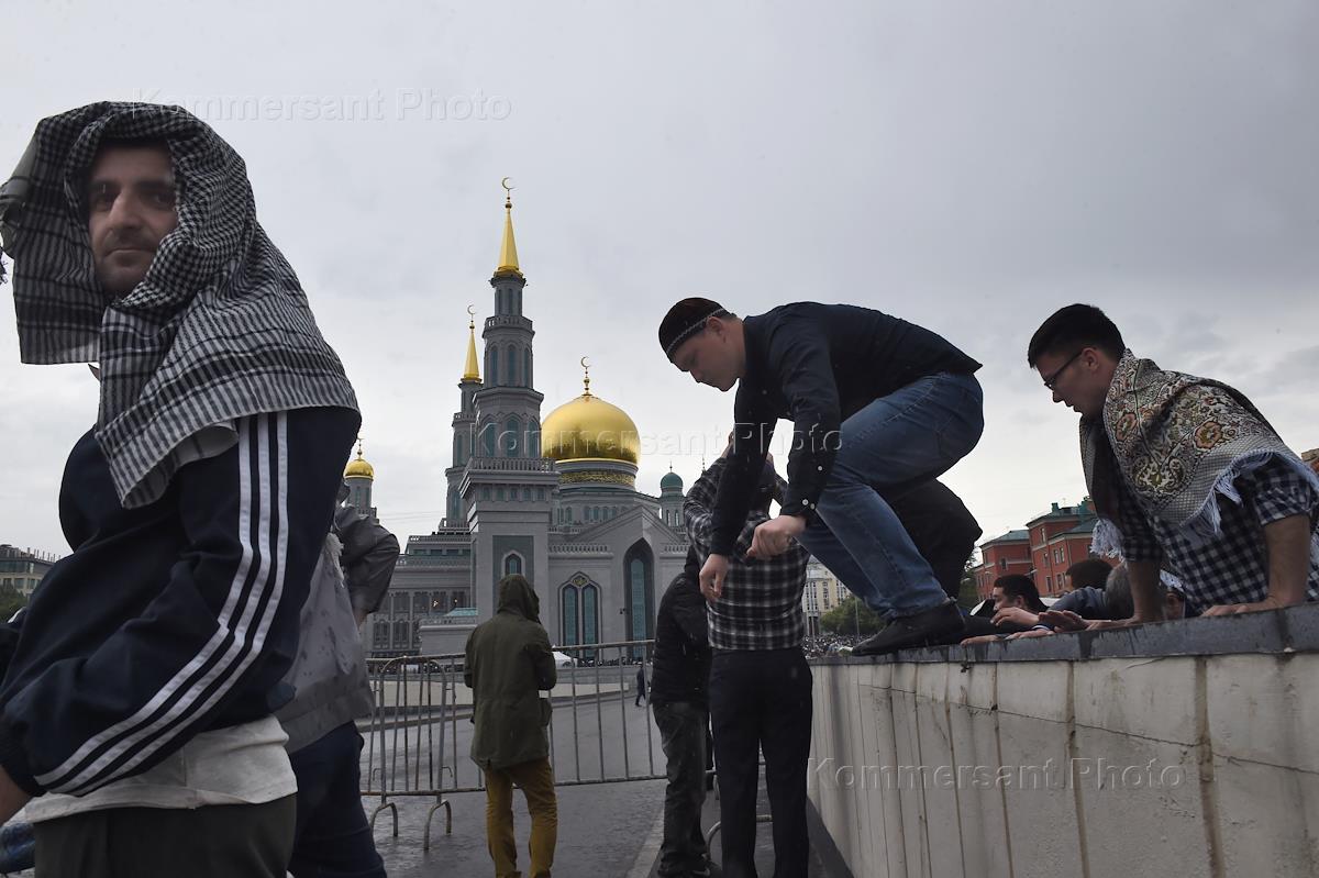Мусульмане в день праздника Ураза-байрам у Московской Соборной мечети.