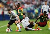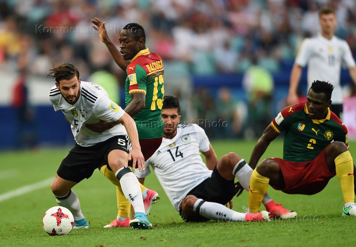 Кубок конфедераций FIFA 2017. Матч между сборными Германии и Камерун на стадионе "Фишт". Слева направо: игрок сборной Германии Марвин Платтенхардт, игрок сборной Камеруна Кристиан Бассогог, игрок сборной Германии Эмре Джан и игрок сборной Камеруна Эрнест Мабука во время матча.