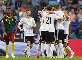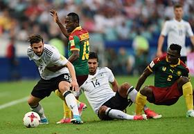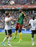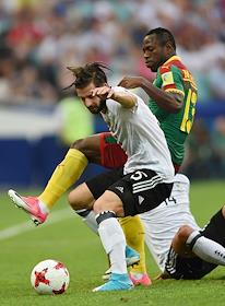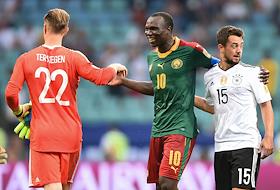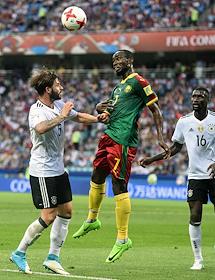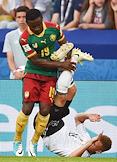 Кубок конфедераций FIFA 2017. Матч между сборными Германии и Камерун на стадионе "Фишт". Игроки сборной Германии (справа) и игрок сборной Камеруна Адольф Тейку Камган (слева) во время матча.