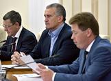 Выездное cовещание Совета безопасности России в Южном Федеральном округе. Глава Рекспублики Крым Сергей Аксенов (в центре) и временно исполняющий обязанности губернатора Севастополя Дмитрий Овсянников (справа) во время совещания.